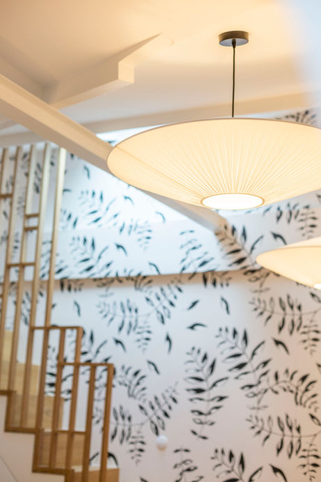 Situé au dernier étage, avec de toutes petites combles, il n'était pas possible de faire une grande mezzanine. Nous avons déposé tous les plafonds, et créé une structure légère pour gagner en hauteur et pouvoir installer un petit coin couchage au dessus du bloc cuisine et SDD. Un sol grillagé au dessus de la cuisine permet aux occupants de se sentir moins oppressés sous cette petite hauteur sous plafond, et de laisser circuler la lumière. Un papier peint (MUES design) habille le grand mur tout hauteur de l'appartement et donne du caractère aux lieux.